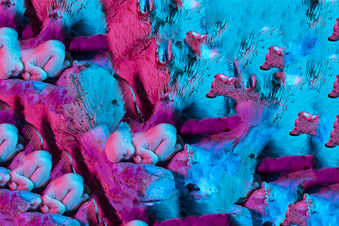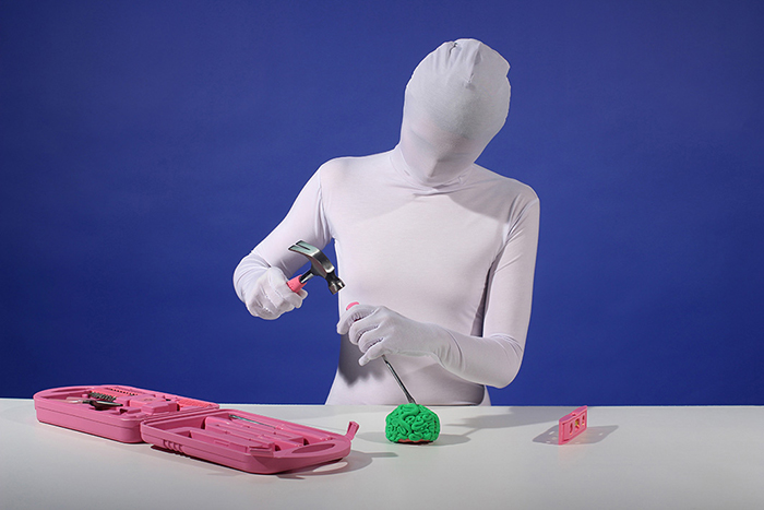 Julie Tixier is a French photographer whose practice explores the way human nature is changing under the influence of emerging techno-sciences. She reflects on how these contemporary advances increasingly question the borders of humanity by altering and redefining our human species and its future evolution. Through her photographs, the artist reinvents the scientific language with non-scientific materials to tackle the experimental conditions of contemporary scientific research. She interlaces scientific methodology and unbridled imagination, blurring the boundaries between the organic and the synthetic, the human and the non-human. Somewhere between reality and fiction, the artist draws attention to complex issues in a satirical and playful language.